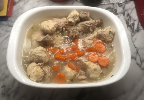 No, there’s no fish anywhere in sight and I am not making fun of anything, certainly not gefilte fish. The polkelech (drumsticks) in the recipe were a recent addition by unanimous vote, because my Mom and I adore them. Excellent for lunch after Rosh Hashanah, and as a forshpeis (appetizer).
