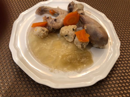 Return stock to a simmer and cook for another half-hour. Remove chicken pieces, chicken balls and carrots (you can slice carrots before placing in fridge) and place in casserole or bowl.
